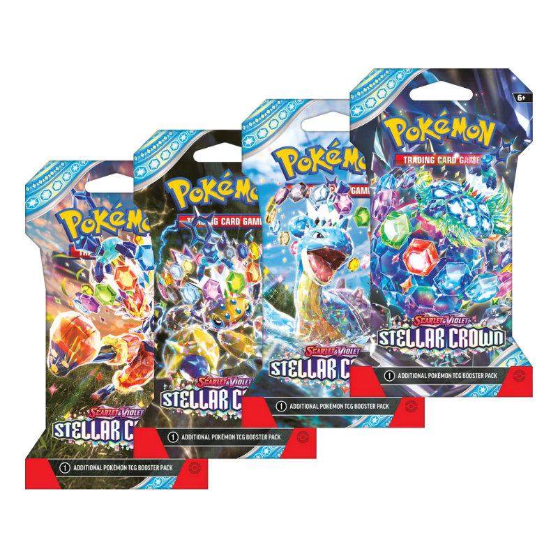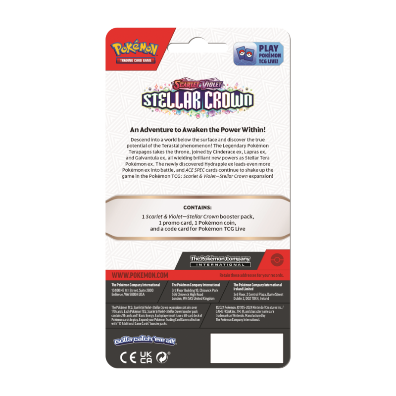 Descend into a world below the surface and discover the true potential of the Terastal phenomenon! The Legendary Pokémon Terapagos takes the throne, joined by Cinderace ex, Lapras ex, and Galvantula ex, all wielding brilliant new powers as Stellar Tera Pokémon ex. The newly discovered Hydrapple ex leads even more Pokémon ex into battle, and ACE SPEC cards continue to shake up the game in the Pokémon TCG: Scarlet & Violet Stellar Crown expansion!