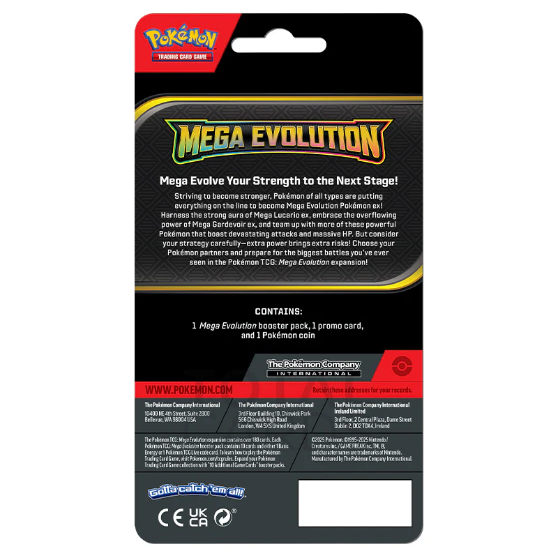 Striving to become stronger, Pokémon of all types are putting everything on the line to become Mega Evolution Pokémon ex! Harness the strong aura of Mega Lucario ex, embrace the overflowing power of Mega Gardevoir ex, and team up with more of these powerful Pokémon that boast devastating attacks and massive HP. But consider your strategy carefully—extra power brings extra risks! Choose your Pokémon partners and prepare for the biggest battles you’ve ever seen in the Pokémon TCG: Mega Evolution expansion!