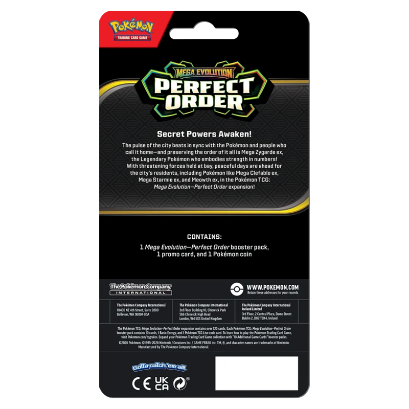 The pulse of the city beats in sync with the Pokémon and people who call it home—and preserving the order of it all is Mega Zygarde ex, the Legendary Pokémon who embodies strength in numbers! With threatening forces held at bay, peaceful days are ahead for the city’s residents, including Pokémon like Mega Clefable ex, Mega Starmie ex, and Meowth ex, in the Pokémon TCG: Mega Evolution Perfect Order expansion!