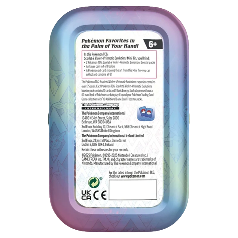 Every uniquely collectible Pokémon TCG Scarlet and Violet Prismatic Evolutions Mini Tin contains 2 booster packs, each with 10 cards and 1 basic energy, an art card, and an Eevee coin in 1 of 8 colours!